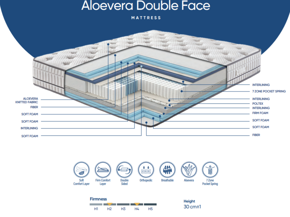 Salteaua Aloe Vera Double Face oferă două niveluri de confort într-un singur produs: H2 pentru o senzație mai moale și H4 pentru susținere fermă. Sistemul de arcuri Pocket Spring cu 7 zone asigură adaptare corectă a corpului și reducerea punctelor de presiune. Husa tricotată cu Aloe Vera contribuie la o senzație plăcută și un mediu de dormit aerisit. Cu o înălțime de 30 cm, este o saltea versatilă, potrivită pentru cei care vor flexibilitate și susținere corectă.