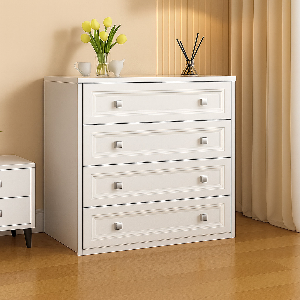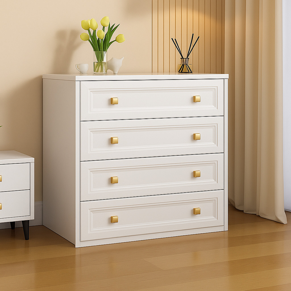 Comodă Bello 2 – Albă, 4 Sertare, cu Butoni Silver & Gold