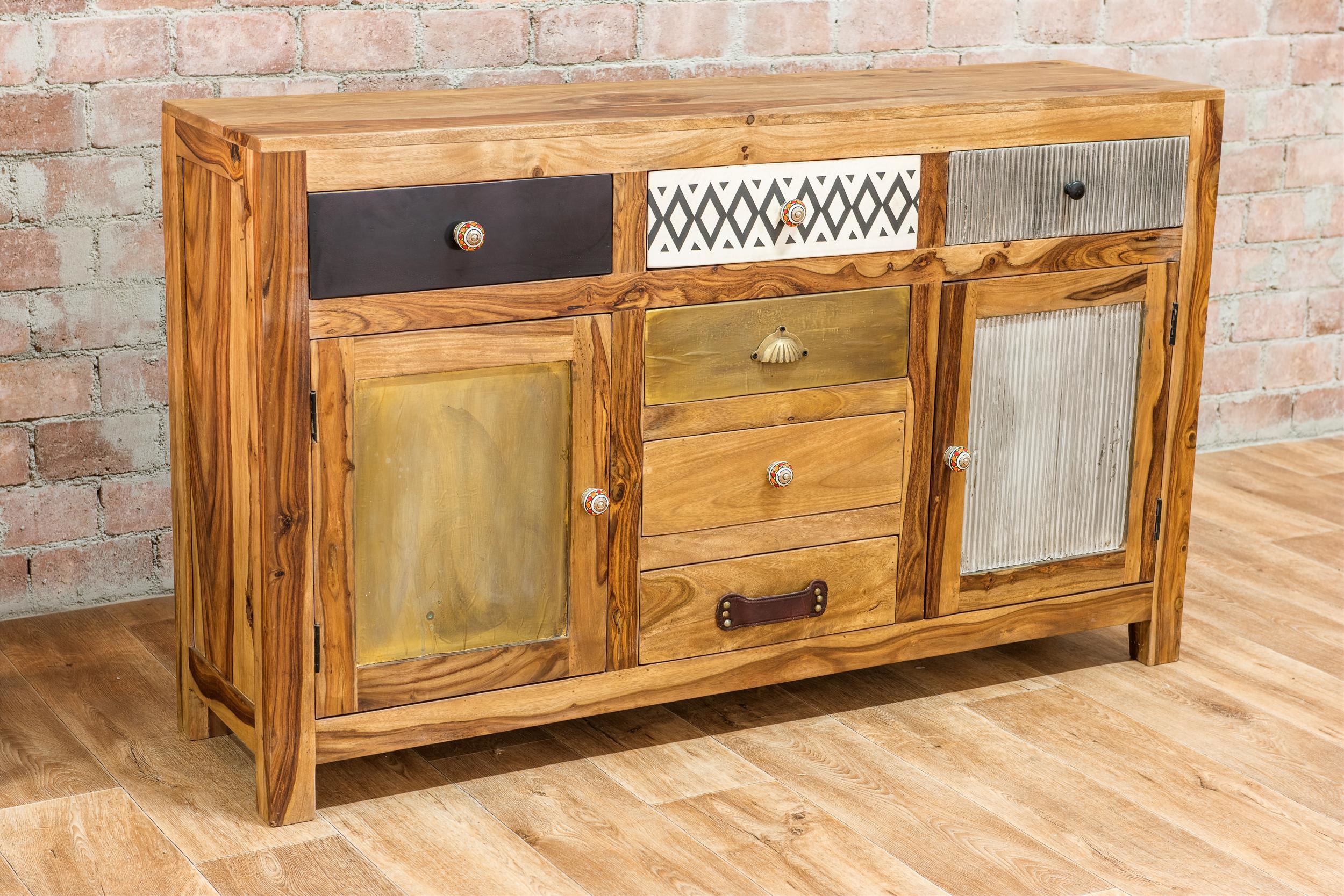 Comoda lemn masiv sheesham, sertare si usi multicolore, placate cu materiale diferite