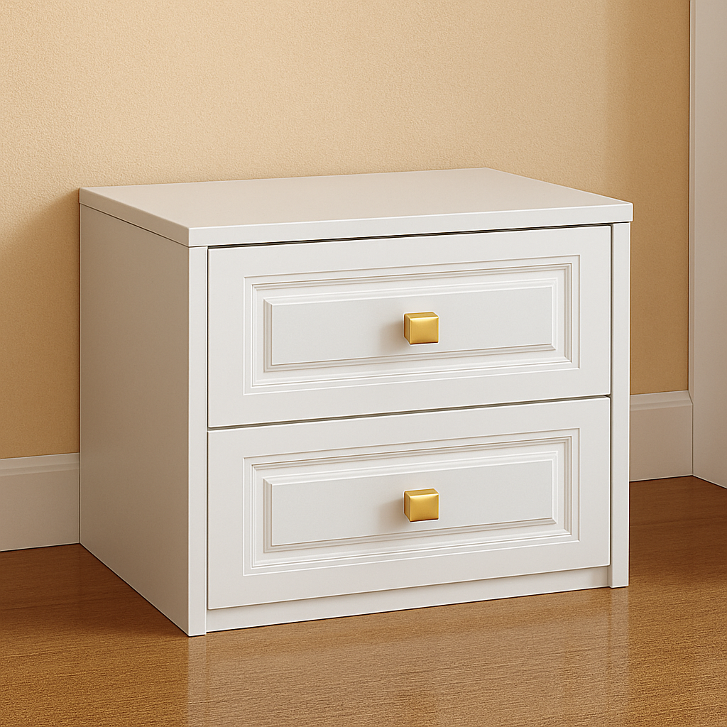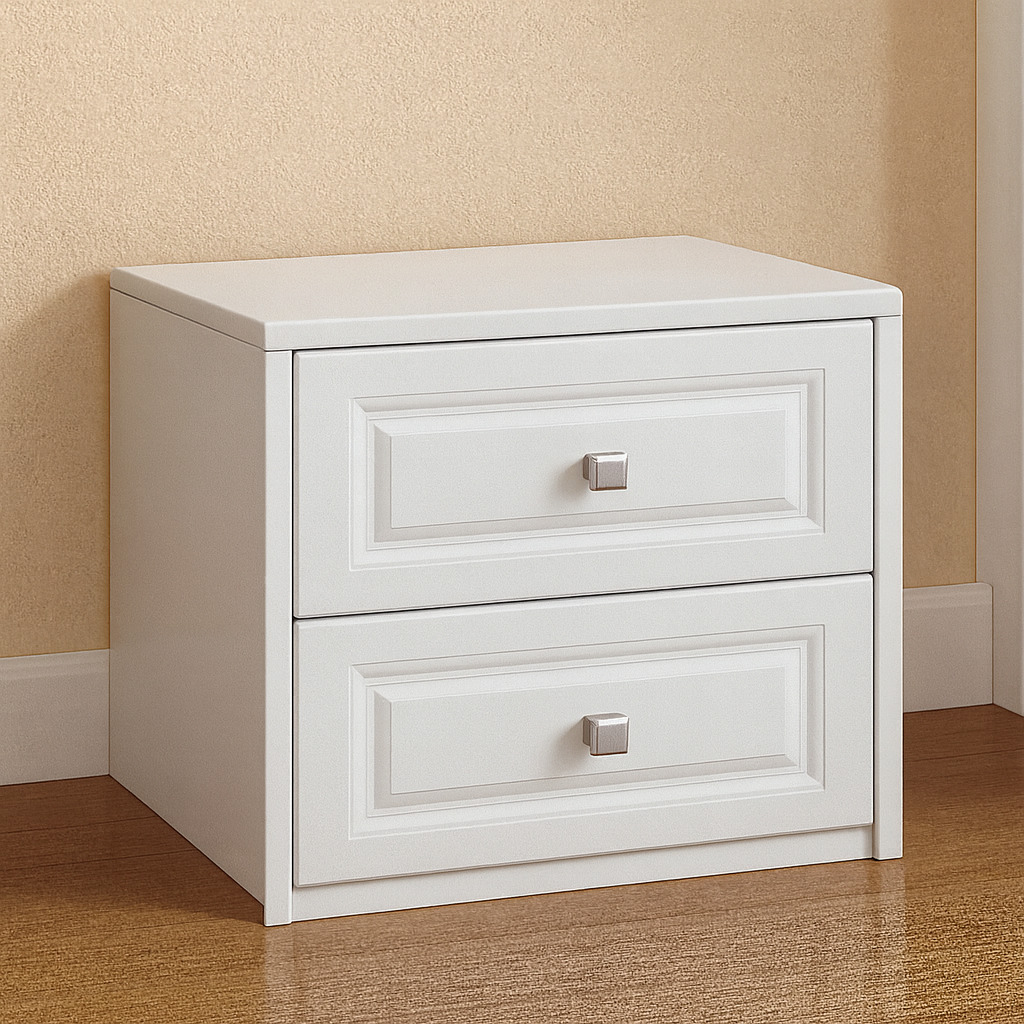 Noptieră Bello 2 – Albă, 2 Sertare, cu Butoni Silver & Gold