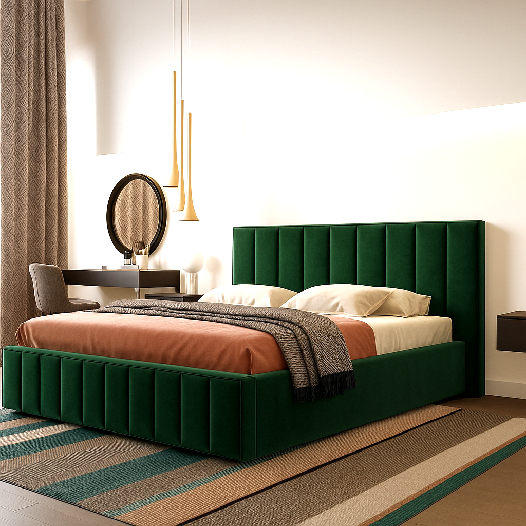 Linii verticale elegante, tapiterie din textil catifelat, stil contemporan, potrivit oricarui dormitor.